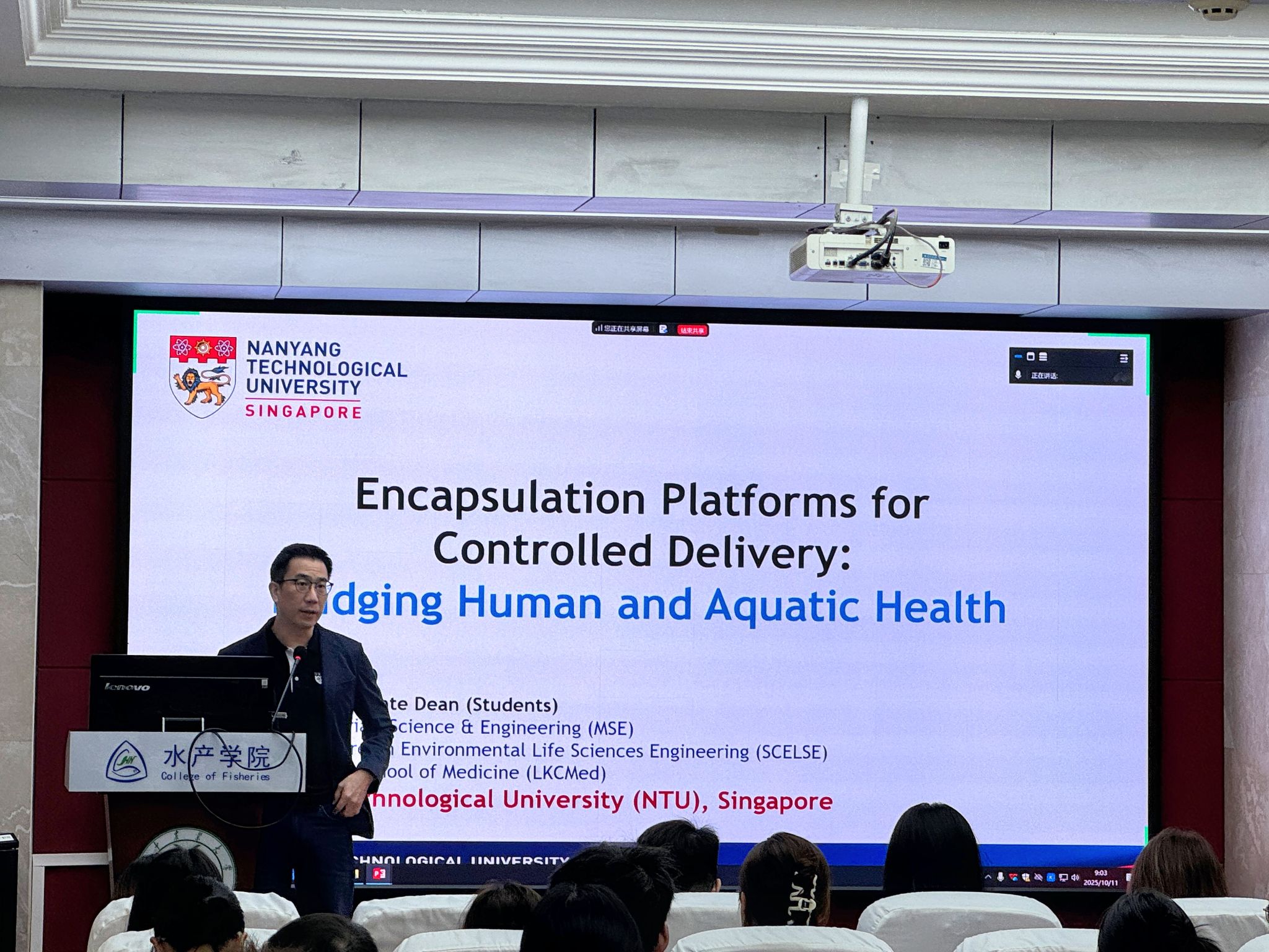 近日,我院2025年第08期(总420期)“水产讲坛”在水产楼A座天辰报告厅举行,特邀Loo Say Chye Joachim教授作专题学术报告,报告题目为“控释包封平台——连接人类健康与水产安全的‘纽带’”。这场报告既饱含学术深度,又贴近产业实际,为在场师生揭开了“包封技术”破解水产养殖难题、推动行业向“高效、绿色、可持续”转型的神秘面纱。