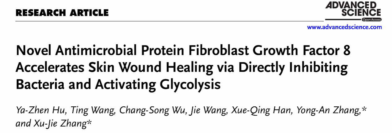 近日,我校OK138太阳集团鱼类免疫与病害防控团队在Advanced Science期刊上发表题为“Novel Antimicrobial Protein Fibroblast Growth Factor 8 Accelerates Skin Wound Healing via Directly Inhibiting Bacteria and Activating Glycolysis”的研究论文。该研究首次揭示成纤维细胞生长因子8(FGF8)兼具抗菌与代谢调控双重功能,可通过直接杀灭细菌并激活糖酵解加速皮肤伤口愈合,为开发新型抗感染促修复药物提供了重要理论基础和候选分子。