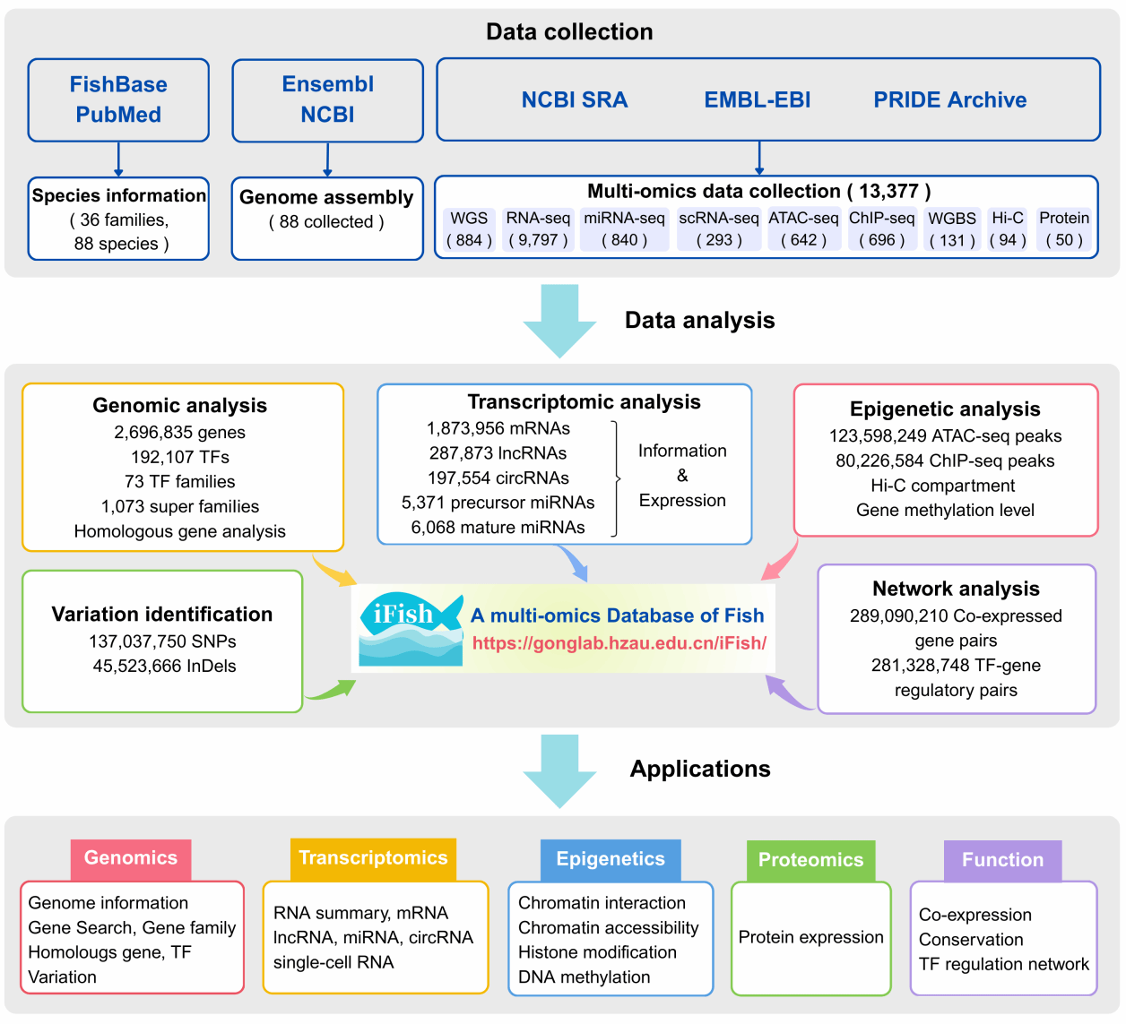 近日,我院高泽霞教授团队联合信息学院龚静教授团队在Nucleic Acids Research期刊上发表题为“iFish: a comprehensive multi-omics database for fish genetics, transcriptional regulation, and epigenetic research”的研究论文。该团队开发的“iFish”综合性鱼类多组学数据库(https://gonglab.hzau.edu.cn/iFish/),不仅整合了基因组图谱、基因表达谱、表观遗传修饰及蛋白质组数据,还实现了遗传变异、转录因子(TFs)及非编码RNA(ncRNAs)的系统鉴定。它是迄今为止系统整合、分析和存储鱼类多组学数据的最全面平台,将成为鱼类遗传学、转录调控和表观遗传学研究的重要资源。