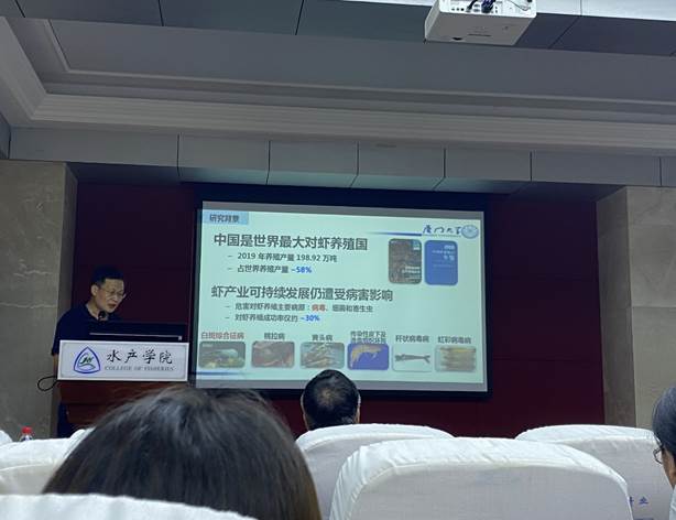 刘海鹏教授以现今中国虾产业可持续发展过程中仍遭受病害影响为研究背景,引出了对于白斑综合征病毒(WSSV)感染机理的研究。刘教授指出因为虾的体内没有适于WSSV感染的细胞系,因此无法完成病毒体外增殖子代病毒和重组改造,这也是WSSV侵染机理研究的关键瓶颈。而刘教授课题组另辟蹊径,对红螯螯虾造血组织Hpt细胞分离培养,并成功在体外增殖子代病毒,为WSSV侵染机制与甲壳类抗病毒研究提供新途径。