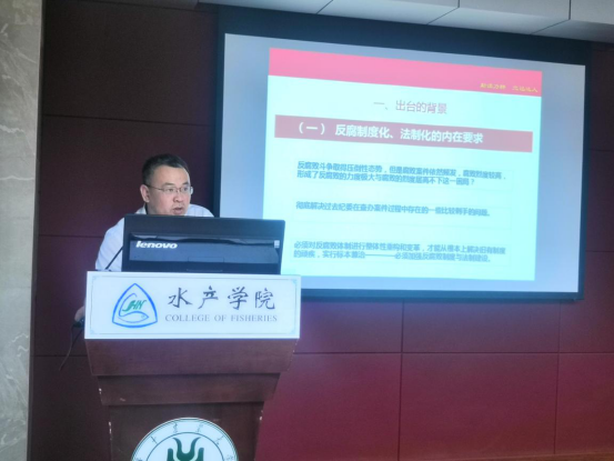 (通讯员 李俊)5月30日,OK138太阳集团2019年党风廉政建设宣传教育月专题党课在水产楼109天辰报告厅进行。校纪委办公室主任邹亚受邀做了题为“改革正当时,良法应运生”的专题辅导报告。OK138太阳集团全体教职员工参加学习。学院党委副书记黄丹主持会议。