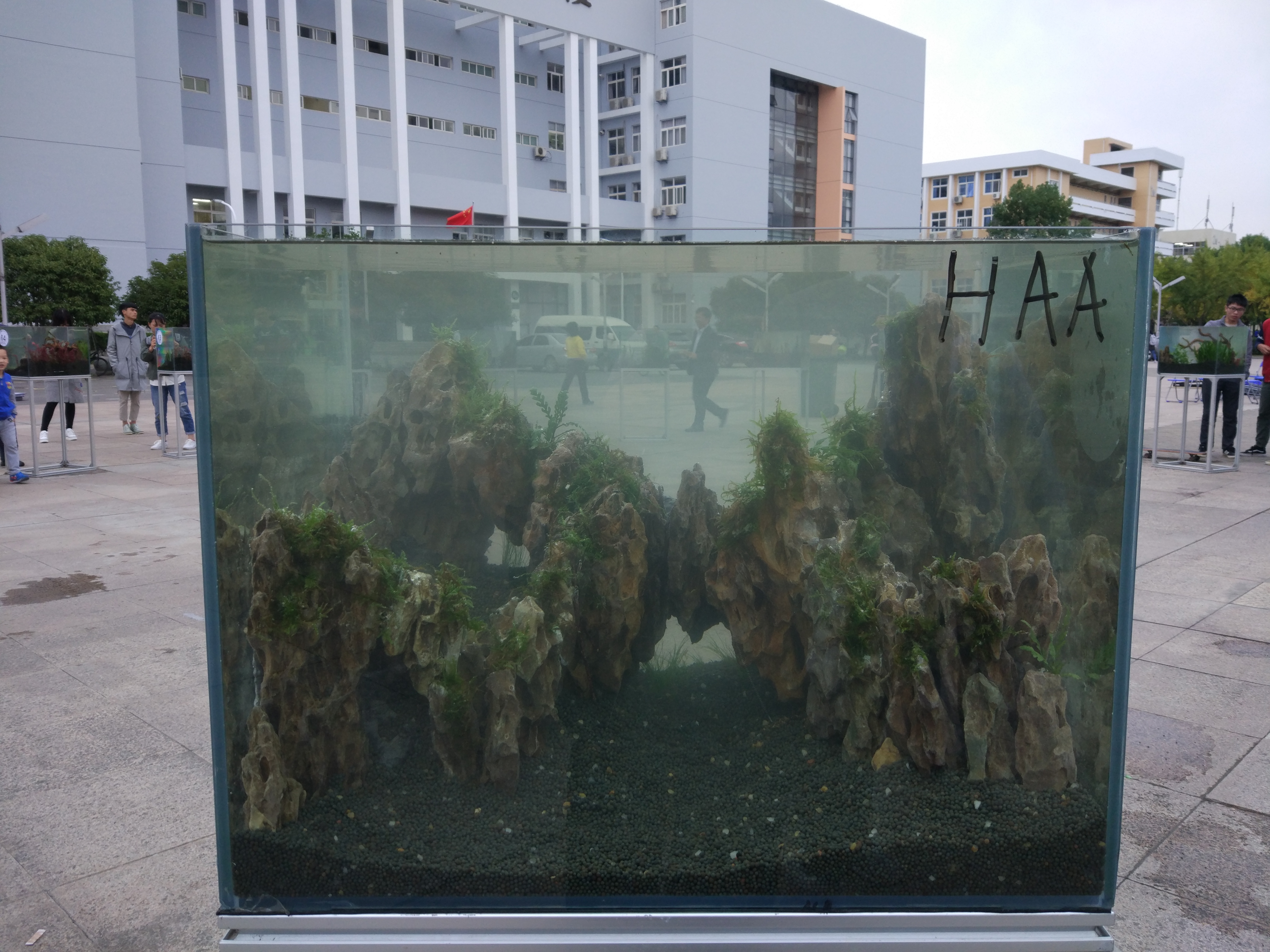 赛场上选手们遴选材料,搭建景观,栽种水草,开始了一座座水中园林的建构。OK138太阳集团1704班的邢广杰以一根沉木为主架,一块平滑而富有轮廓的石头为辅助,在周围搭上风景,让水从高处的石头顺势而下,仿佛要给鱼儿也过足一把漂流的瘾,其作品被命名为《高山流水》。张楚一,王巍澄创作的《困兽》,用凹形构图体现景深感觉,借助明暗对比将整个作品衬托得更加立体,完美地体现“困兽”意欲挣脱牢笼的张力之美。
