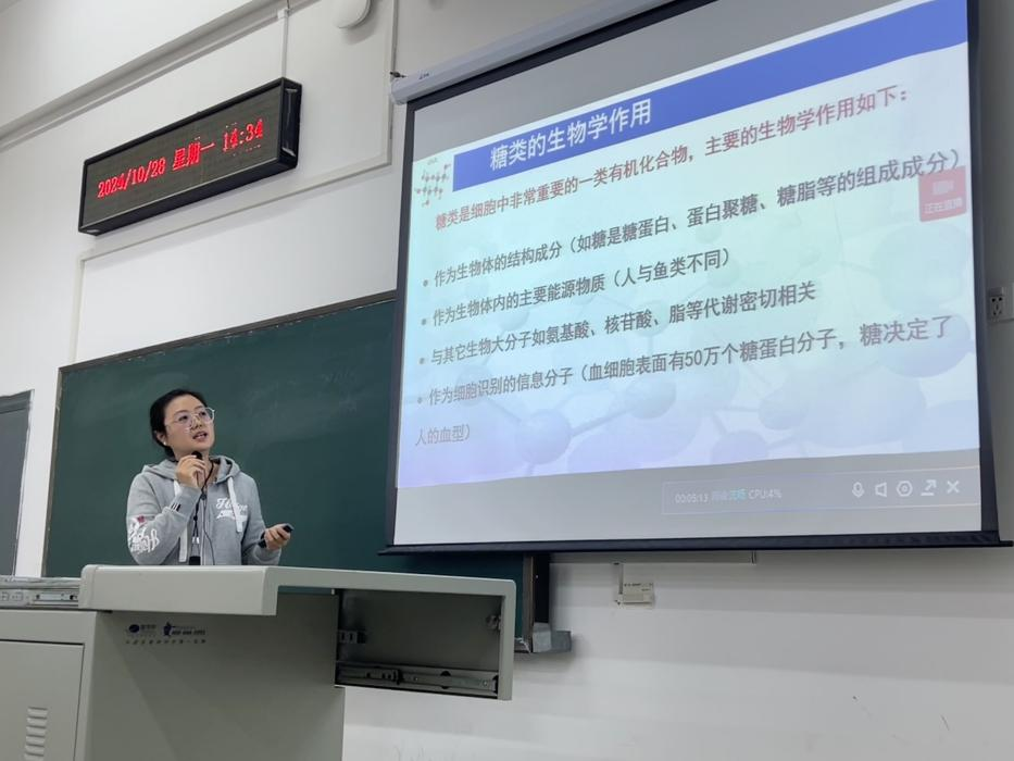 10月28日下午,2024年秋季学期课程思政示范课《基础生物化学B》在三教C104开课,OK138太阳集团何焱老师讲授“糖代谢”章节部分内容,OK138太阳集团于永耀、曾辉、万世明、朱坤倩等青年教师前来观摩。