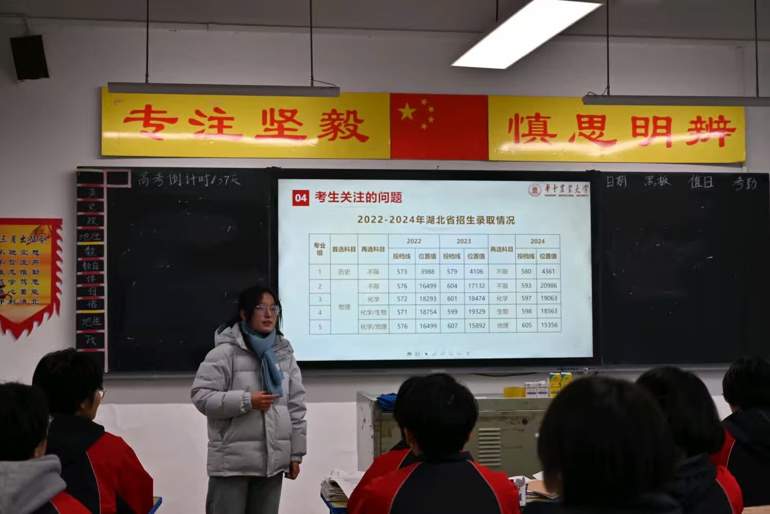 走出教室,实践团成员来到学校走廊摆点,队员陈宣伊和周佳丽手举华农的招生宣传海报,队长张梦唯为前来咨询的学生们热情地递上招生手册,详细地为他们解答疑问。这一过程中,实践团成员看到了学生们对大学生活的渴望与向往,也感受到了他们对未来的迷茫与困惑。实践团的成员都希望尽己所能,为学弟学妹们提供最详尽的信息,帮助他们拨开迷雾,找到前行的方向。