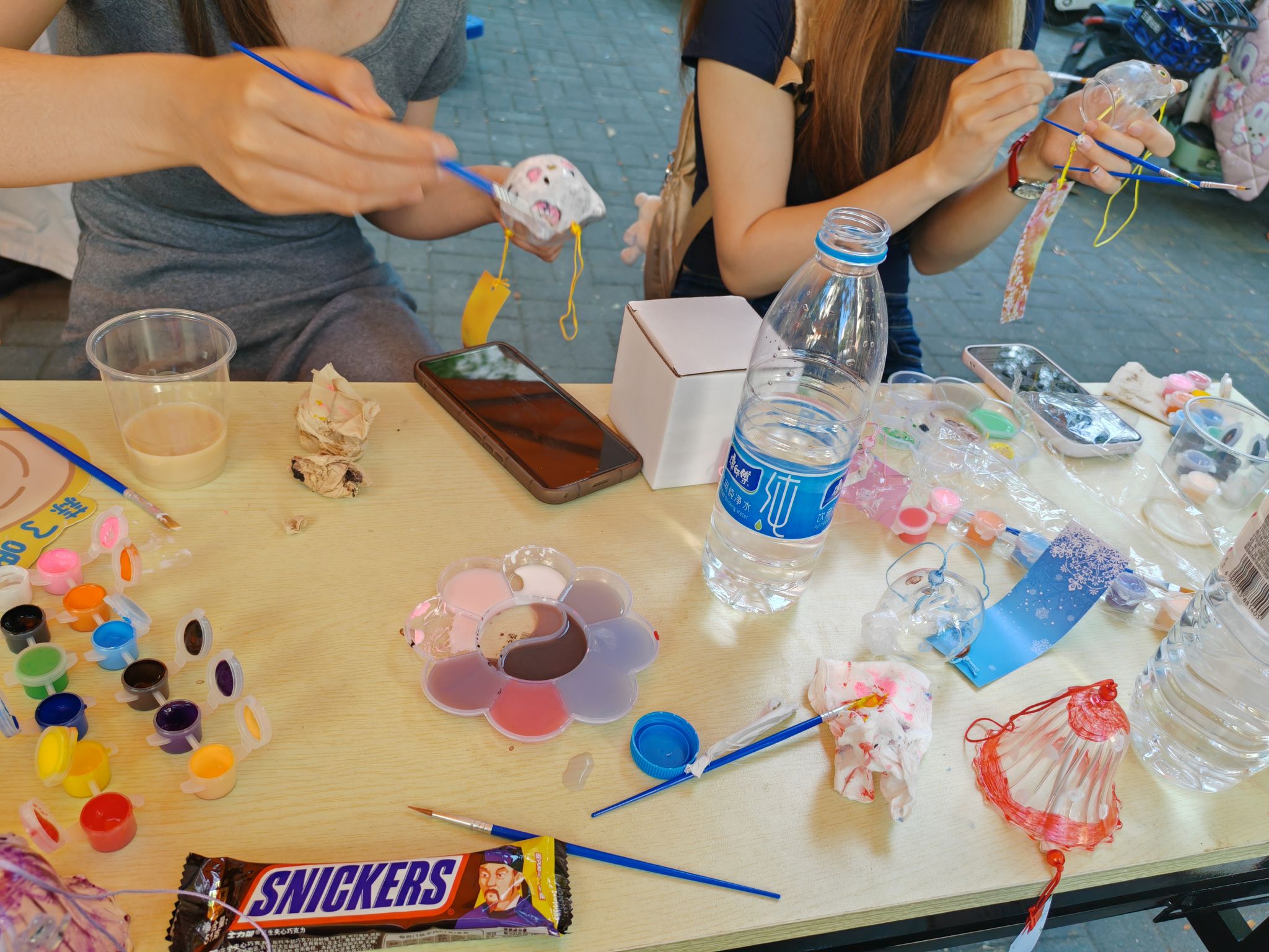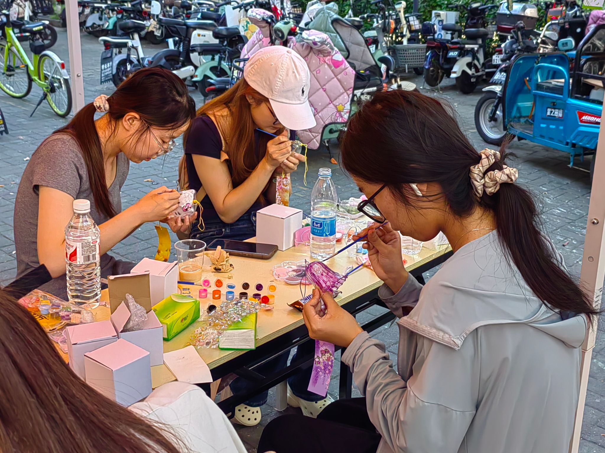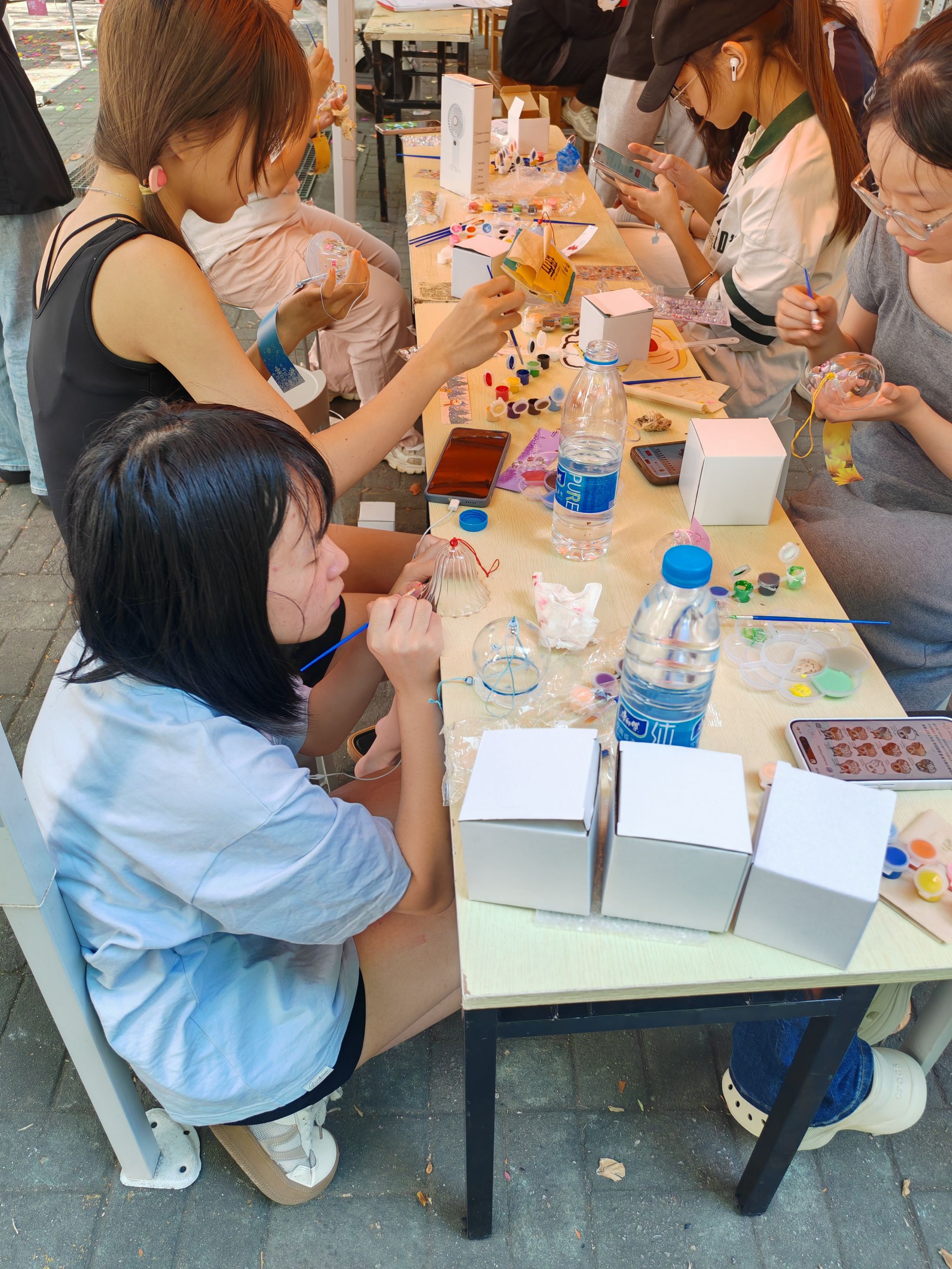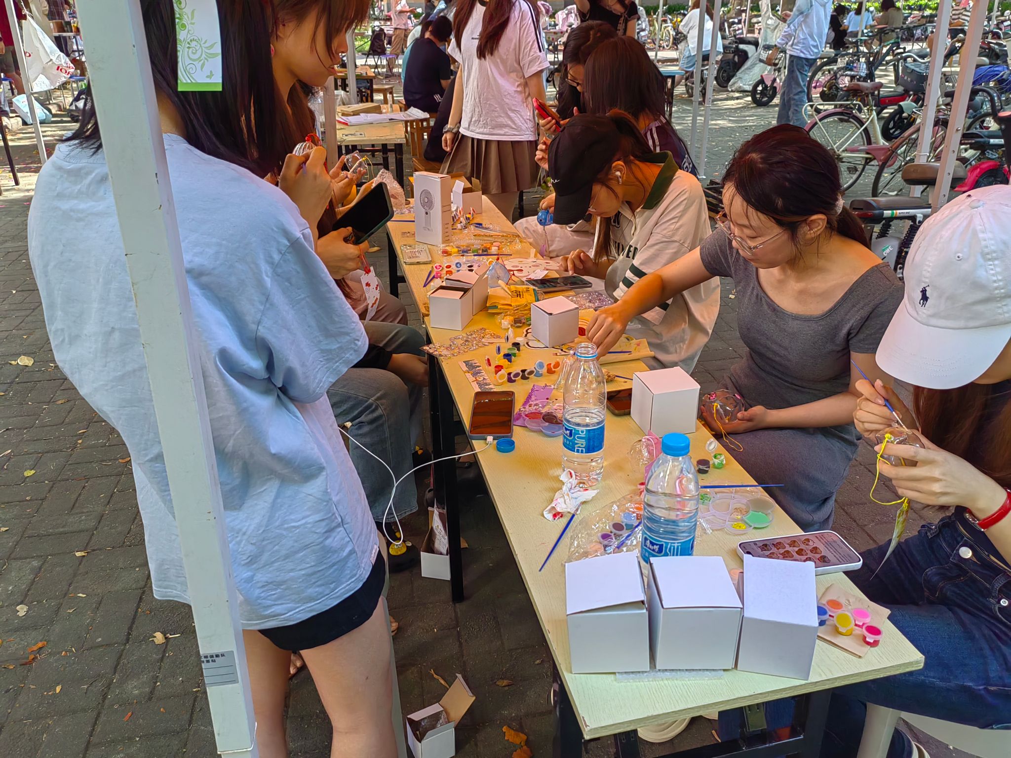 活动现场,一张张长桌铺满缤纷的玻璃颜料与调色盘,参与者们或凝神勾勒,或笑语交流,将天马行空的创意倾注于素色风铃之上。深邃的星空、可爱的小动物……贴纸的灵动与颜料的斑斓交织,每一笔色彩都承载着青春的畅想,每一串风铃都化身为独特的艺术符号。完成作品的同学可领取限定款扇子与明信片,或珍藏留念,或将风铃与装饰明信片一同悬挂于展区,让春日的微风为作品注入灵动的生命力。