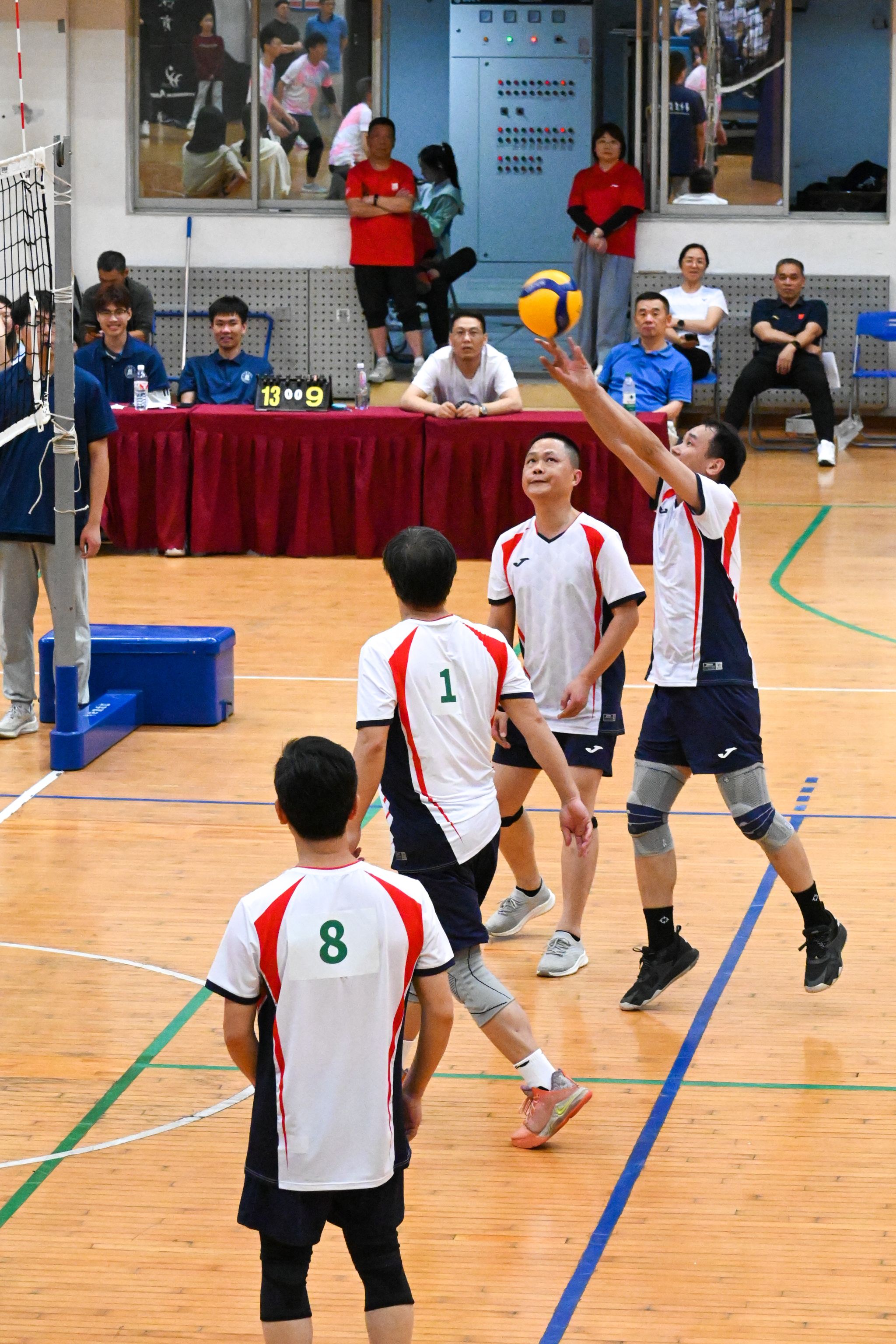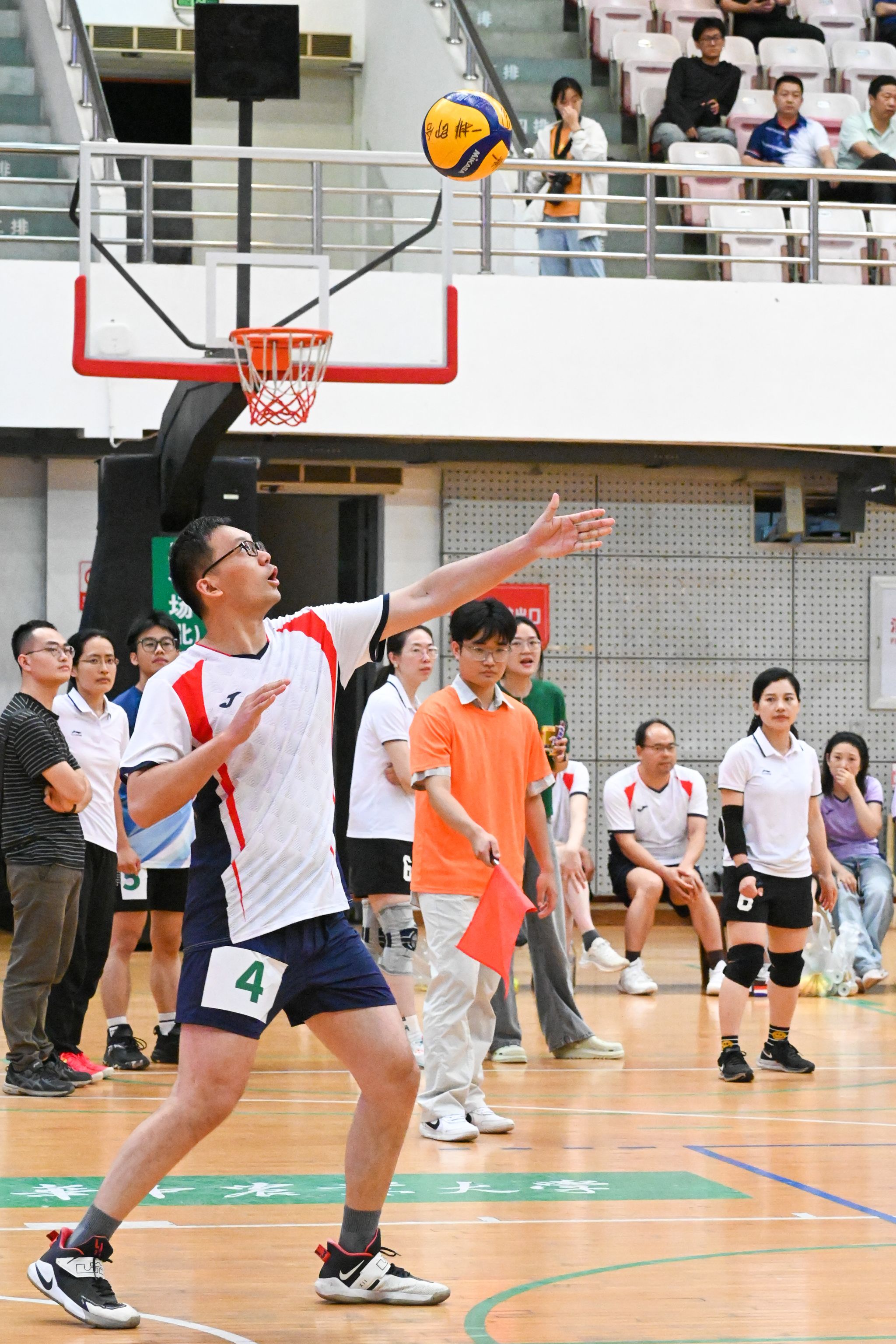 我院教工男排对阵经济管理学院教工男排。比赛伊始,水产男排状态稍显慢热。经管队凭借稳定的发球和快速多变的进攻迅速占据优势,水产男排一度陷入被动。在2:7的不利局面下,水产队请求暂停,及时调整战术。暂停过后,队员们展现出良好的团队默契,连追3分,赢得场边观众阵阵掌声。面对对手持续强劲的进攻,水产队顽强抵抗,最终以16:25遗憾落败首局。