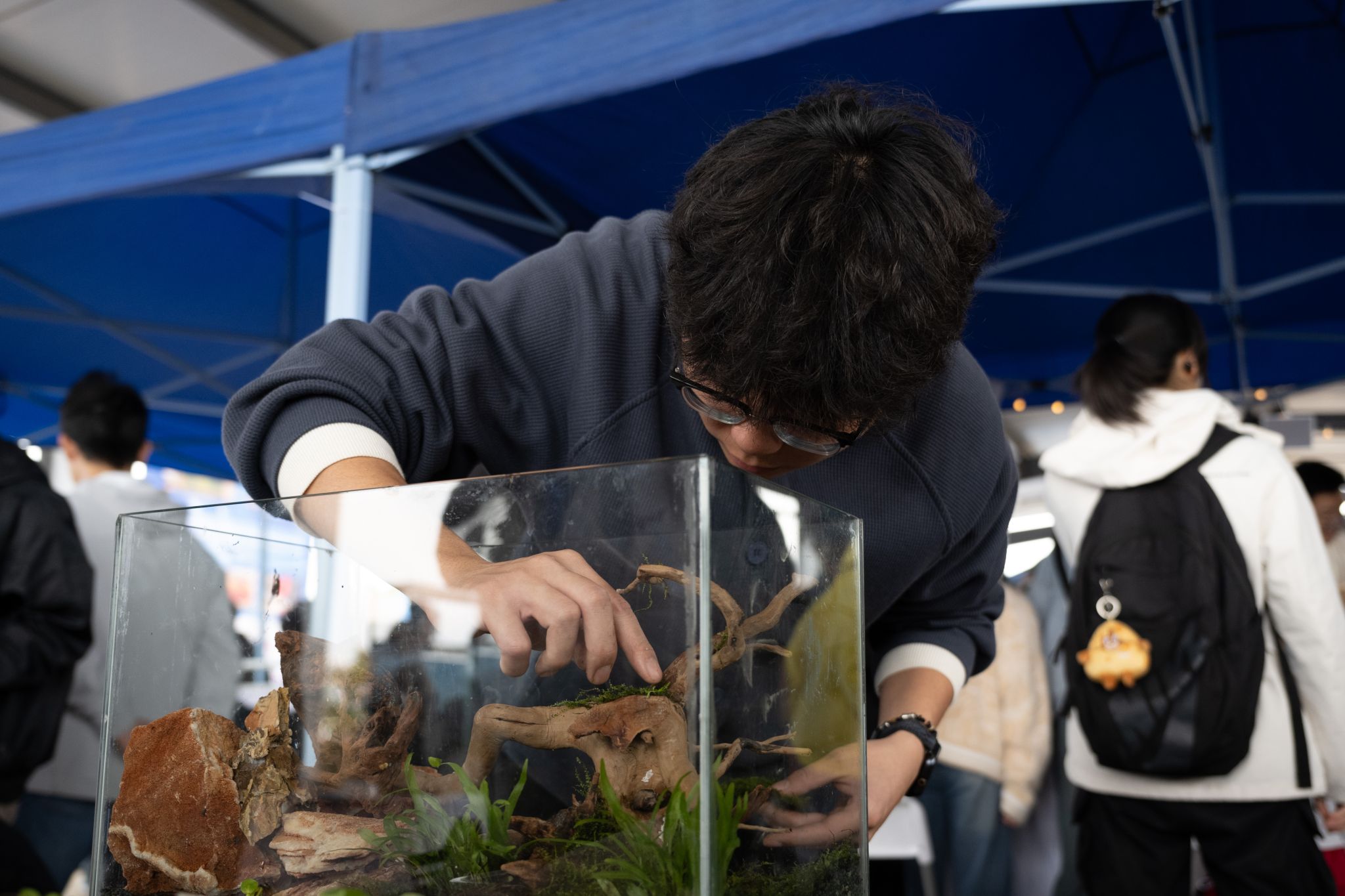 微景观DIY活动区,同学们正专注构建手中的方寸天地。轻石、水苔、赤玉土等专业材料,共同构成植物生长的根基。同学们俯身调整植物布局,交流造景心得,一个完整的微生态系统在斜口玻璃瓶中悄然成型。这场融合美学与生态科学的创意实践,成为本届渔文化节中一道独特的风景。