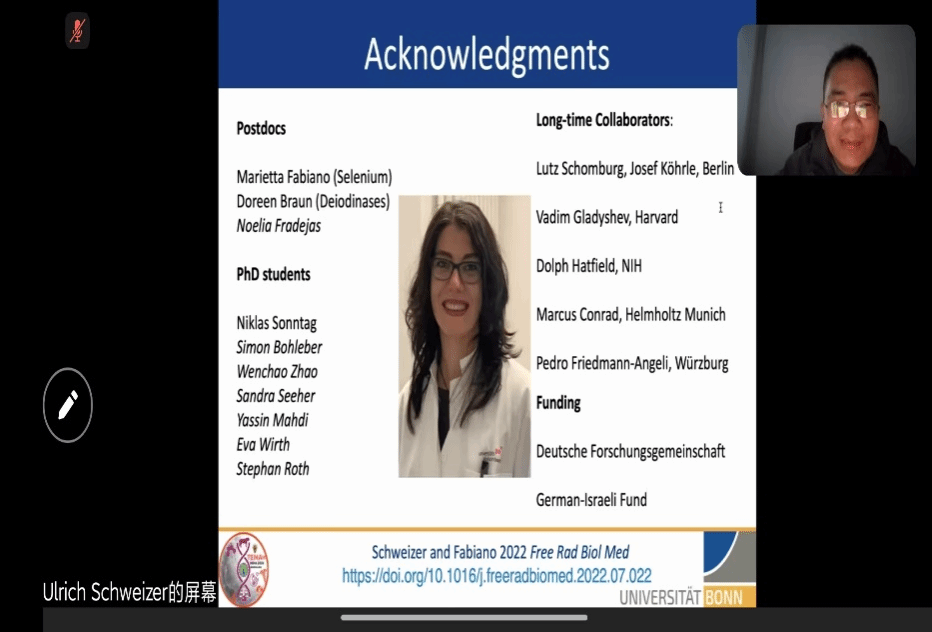 Schweizer教授首先讲述了硒蛋白生物合成的过程,再围绕“基因、生物化学和人类疾病”三个关键词,从硒蛋白缺乏症、硒代谢、铁死亡、癌症及新型硒蛋白基因(EEFSEC)的功能等方面展开介绍。