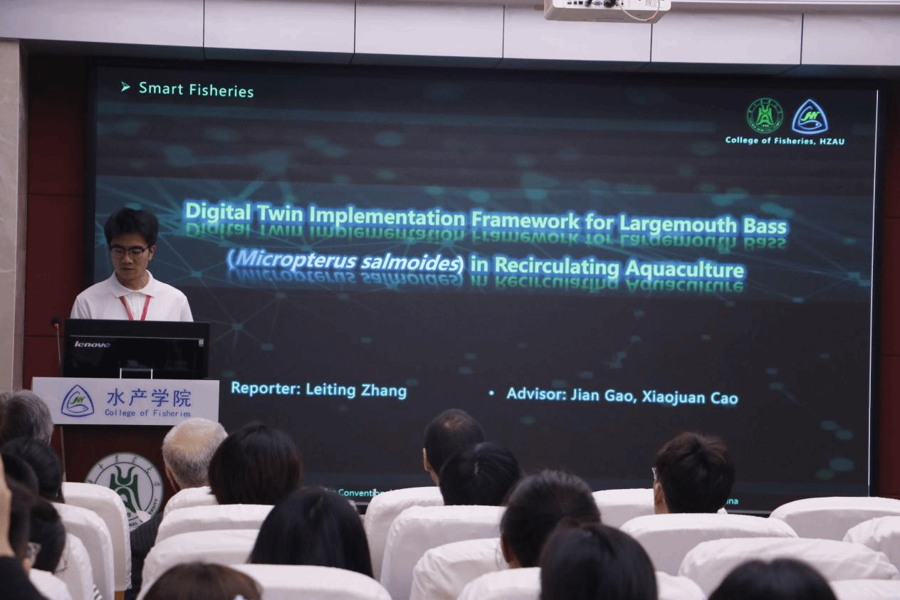 随后,ok138cn太阳集团另一位博士生张雷霆作了题为“大口黑鲈循环水养殖系统的数字孪生实施框架”的报告。针对传统水产养殖面临的资源与环境压力,该研究构建了一套六层数字孪生系统:从物理层到决策层,通过水下摄像头、声学传感器等设备实现鱼类摄食行为量化分析,并利用Unity引擎建立三维动态模型。实验显示,该框架能有效整合水温、pH值等环境参数与个体行为数据,显著提升养殖密度与投喂精准度。他强调,数字孪生技术可降低循环水系统30%的运维成本,为智慧渔业发展提供了可复用的技术范式。