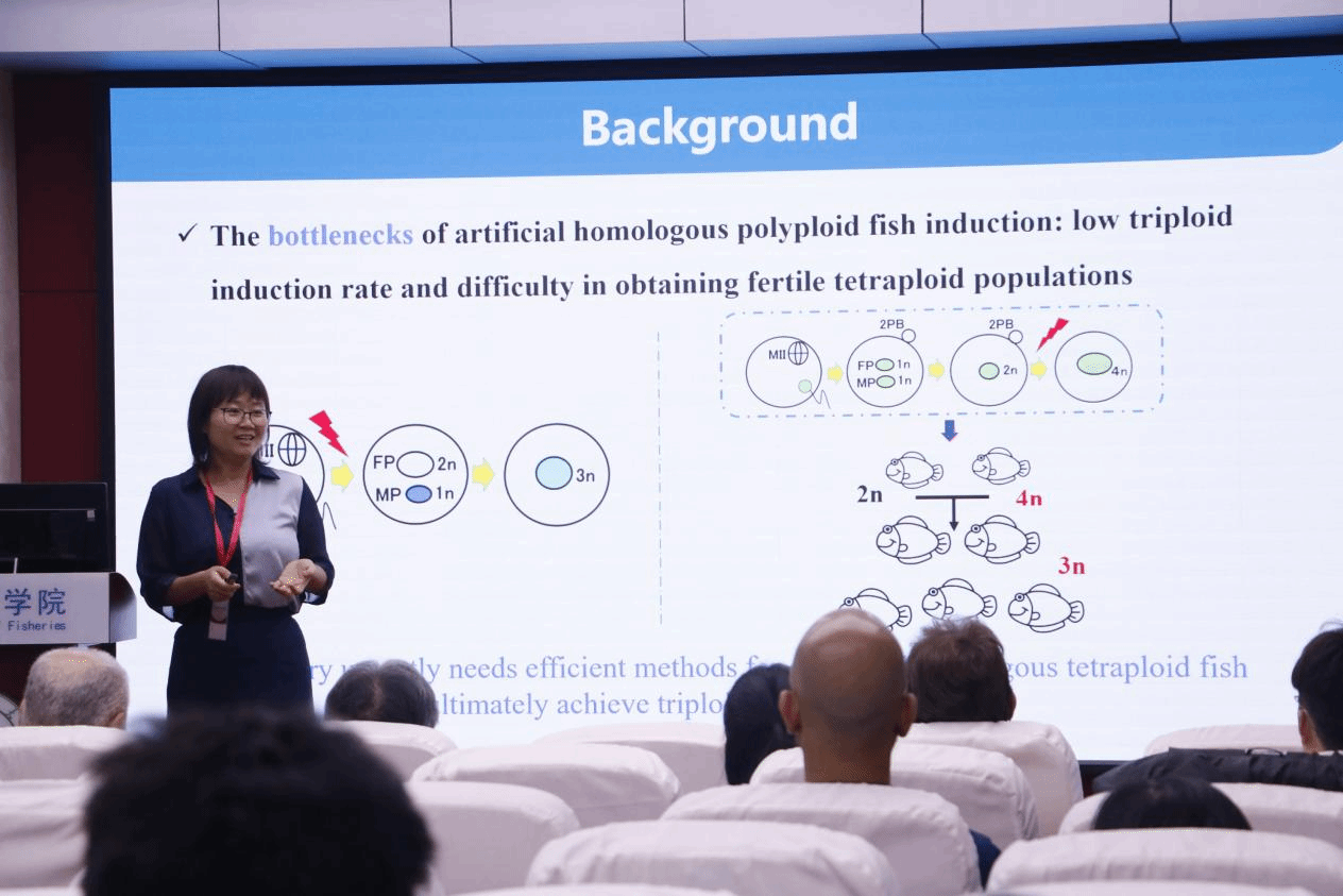最后,ok138cn太阳集团曹小娟教授作了题为“有丝分裂缺陷导致鱼类不减数精子发生”的报告。报告揭示了细胞周期调控关键基因cdk1/2和分离酶基因espl1在鱼类不减数精子发生中的重要作用。通过基因敲除实验,她所带领的团队发现Cdk1和Espl1功能缺陷会导致精母细胞有丝分裂异常,进而产生二倍体不减数精子。这类不减数精子与正常卵子结合后可形成三倍体。通过架设‘三倍体桥’成功获得了人工四倍体。人工四倍体与野生型二倍体交配后,产生了全三倍体群体,孵化率达80%以上。该成果为水产养殖三倍体育种提供了新的技术路径,可解决传统温度休克或静水压诱导法存在的效率低下等问题。