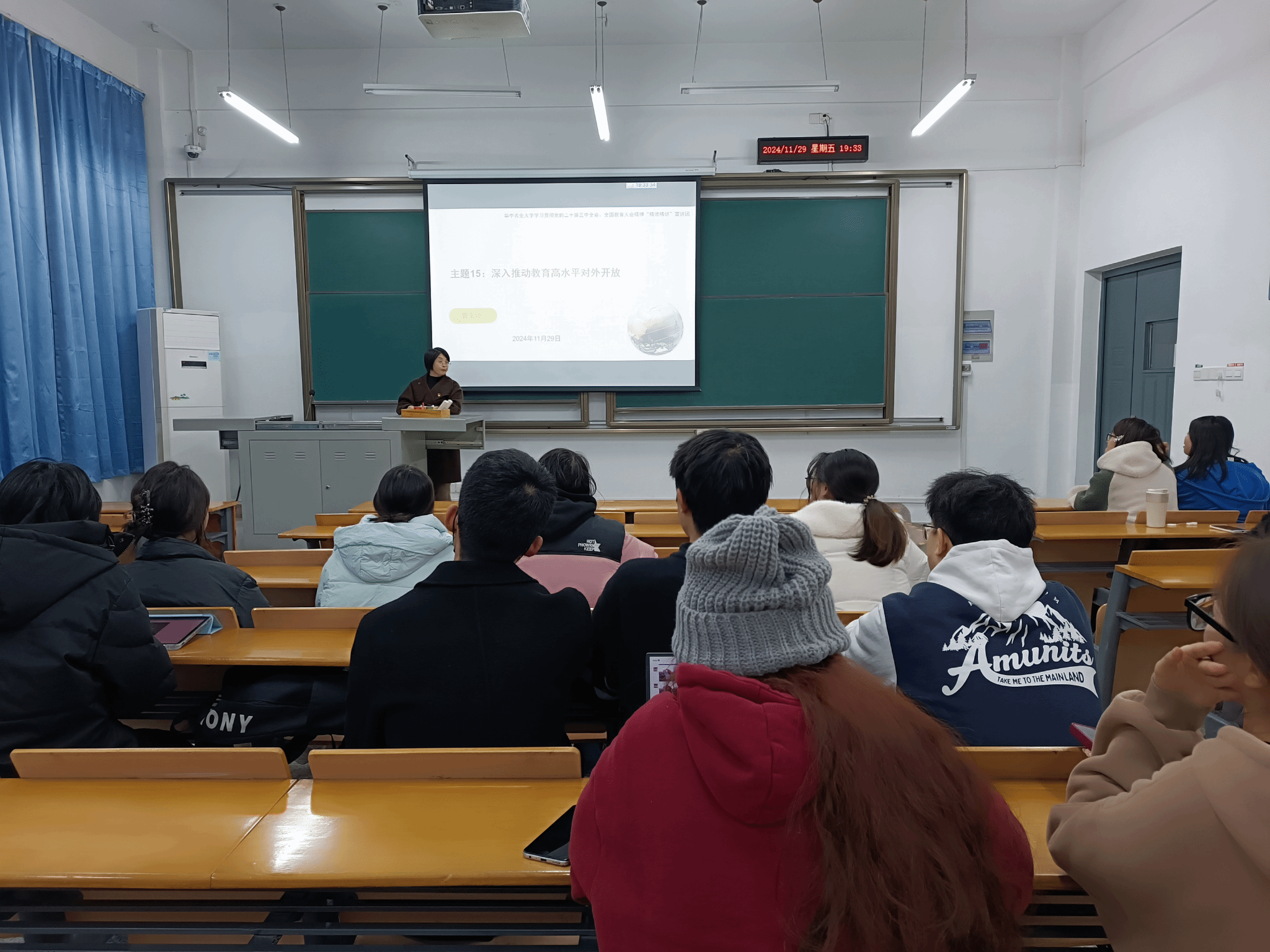 曹玉琼根据习近平总书记在党的二十届三中全会和全国教育大会精神上的重要讲话,来阐释为什么要深入推动教育高水平对外开放、如何才能深入推动教育高水平对外开放、以及在深入推动教育高水平对外开放的过程中青年大学生党员何为三个问题。