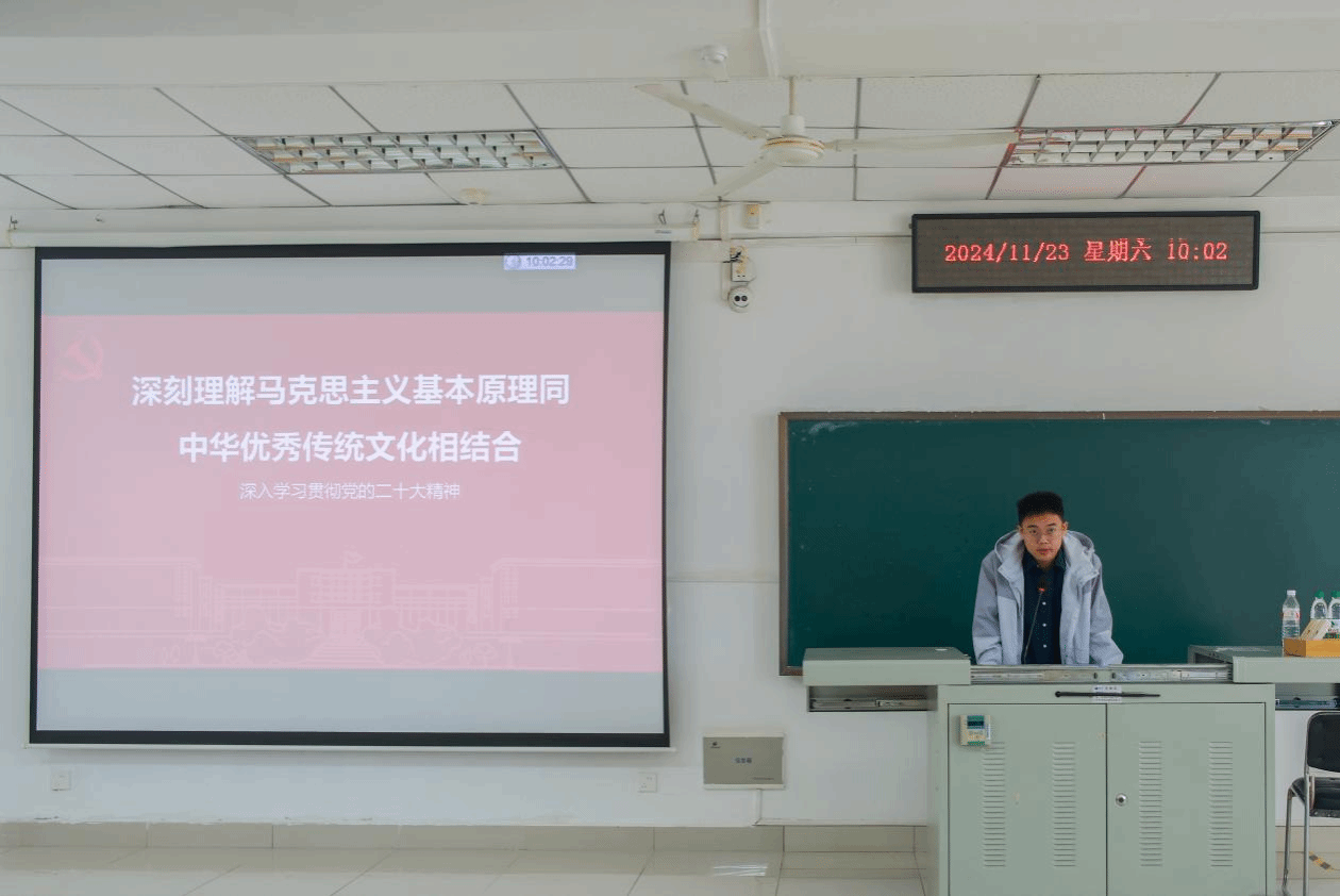 11月23日上午10:00,OK138太阳集团团委书记毕晨在三教A305教室为OK138太阳集团24级大一新生带来了第三次团课,本次团课的主题是“深刻理解马克思主义基本原理同中华优秀传统文化相结合”。