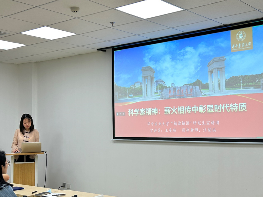 王雯瑄同志讲述了什么是科学家精神、为什么要弘扬科学家精神、如何弘扬科学家精神,并以陈华葵院士、陈焕春院士、傅延栋院士等科学家的经历,对科学家精神进行深刻阐述。王雯瑄谈到:“作为新时代中国青年,不能贪图享受,不思进取,我们要不断学习前人经验,与中国式现代化相结合,传承科学家精神,有大格局、勤思考、抓落实、多协作。与祖国同行,为人民服务”。
