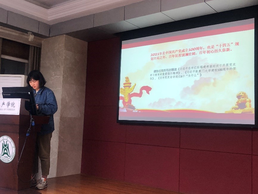 (通讯员:丁雨妍)2021年是中国共产党成立100周年,也是“十四五”规划开局之年,百年征程波澜壮阔,百年初心历久弥新。为此,4月22日晚九点十分,遗传育种与繁育研究生第二党部和营养与生理研究生党支部共同在水产楼109展开了四月份主题党日活动,育种二支部副书记罗奕主持会议。