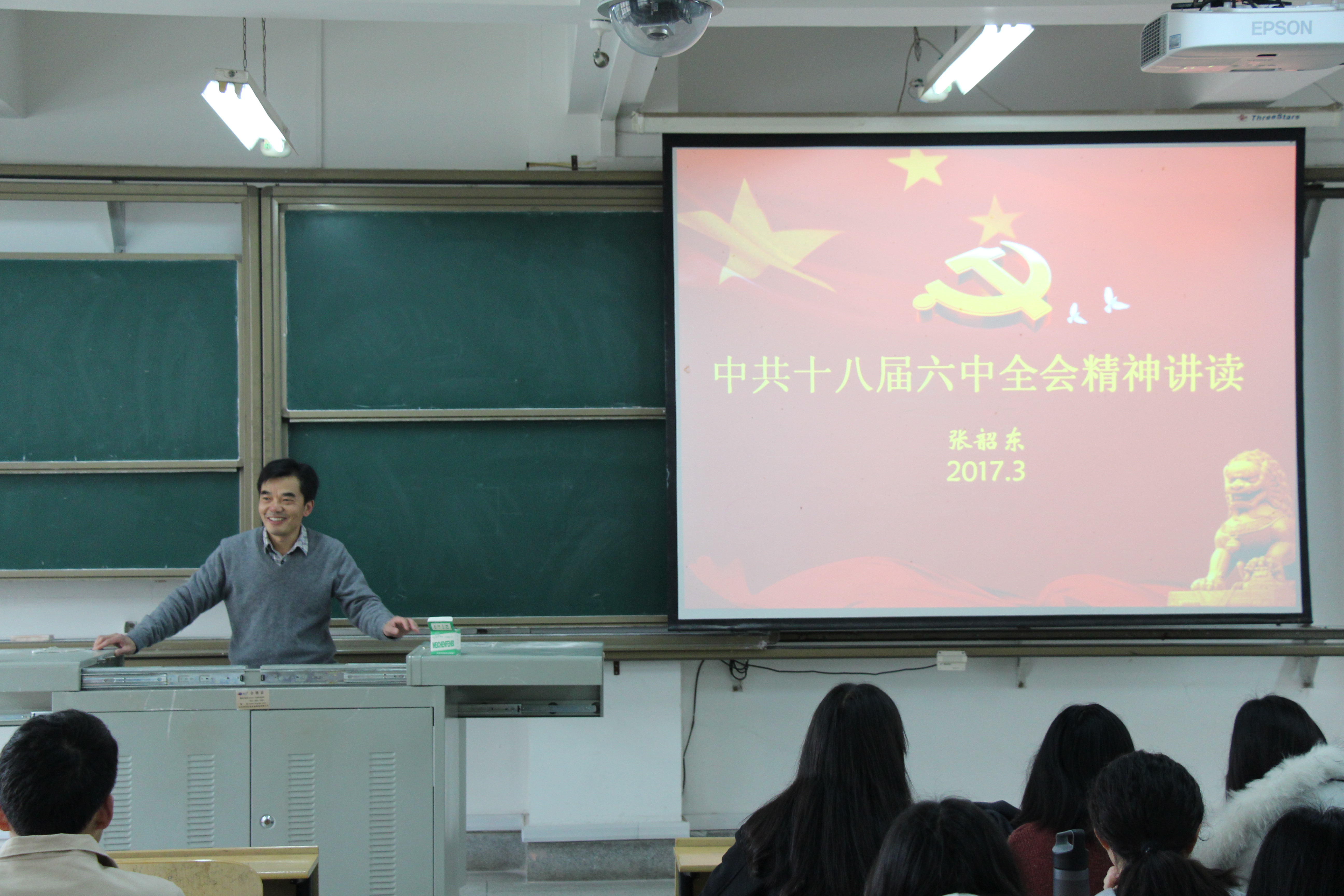 张韶东向大家作了“十八届六中全会精神的讲读”的专题报告。首先,他带领大家回顾了十八大以来党协调推进“四个全面”战略布局的情况,介绍了我党召开的历次重要会议和重要举措。接着,他介绍了十八届六中全会的召开情况和重要成果。重点解读了《关于新形势下党内政治生活的若干准则》《中国共产党党内监督条例》两部党内法规。《准则》继承了党的优良传统,集纳了党的创新成果;《条例》则以党章为根本依据,具有坚持问题导向,将继承和创新有机统一,体现了约束和激励机制相结合等特点。在此基础上他还解读了我党的“四自”传统。“四自”使中国共产党具有强大的生命力,是管党治党的优良传统,是区别于其他政党的显著标志,是中国共产党永立不败之地的法宝。他希望大家在“严紧硬”的背景下,不断增强“四个意识”,倡导“三严三实”,坚持“两学一做”,不断提高自身党性修养。