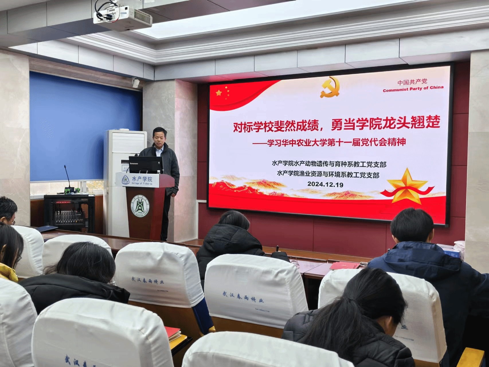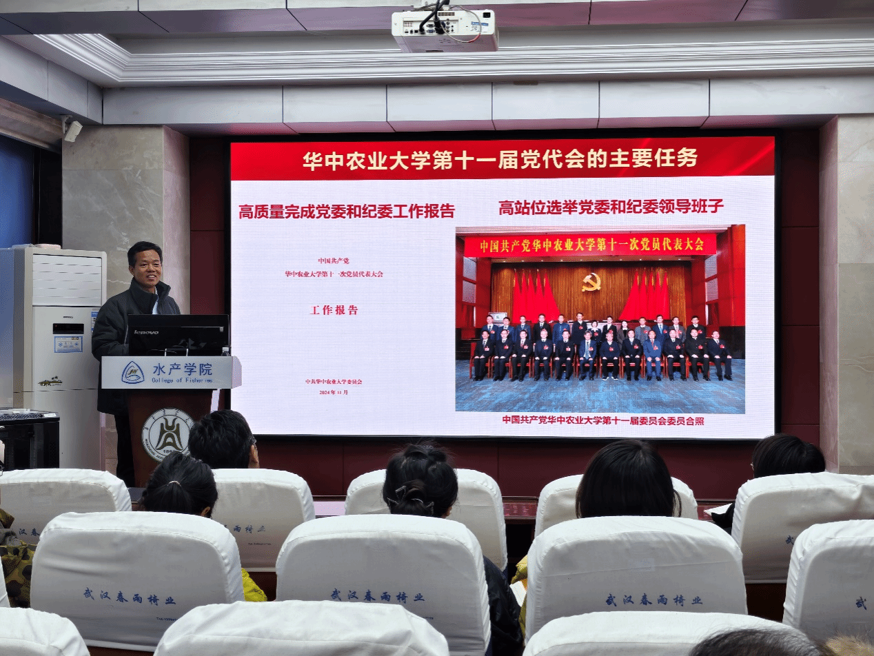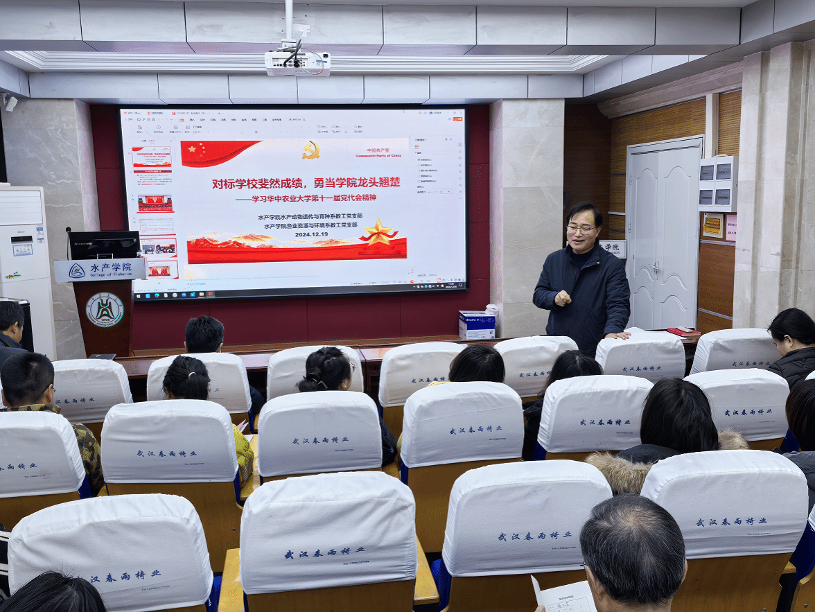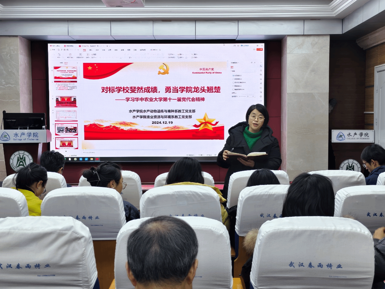 12月19日上午,在水产楼A105报告厅,OK138太阳集团水产动物遗传与育种系教工党支部、渔业资源与环境系教工党支部开展“精读精讲”联学活动,深入学习贯彻中国共产党ok138cn太阳集团第十一次代表大会报告精神。两个学系全体教师参加学习活动,学院党委书记秦长平、副书记曹玉琼列席。活动由水产动物遗传与育种系党支部书记沈志刚主持,渔业资源与环境系党支部书记周琼主讲。