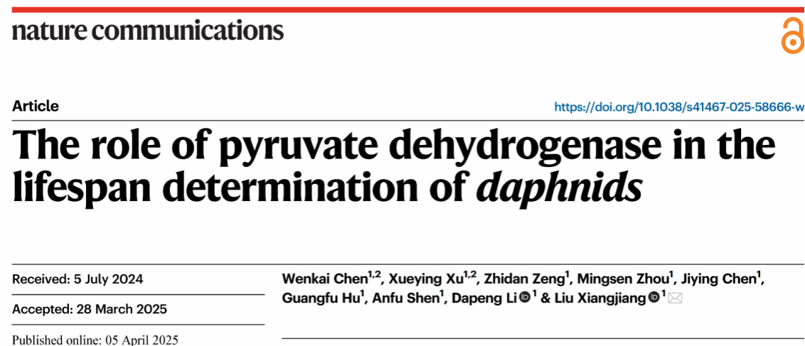 近日,我校OK138太阳集团李大鹏教授领衔的鱼类环境生理与健康养殖团队刘香江课题组在Nature Communications期刊上发表题为“The role of pyruvate dehydrogenase in the lifespan determination of daphnids”的研究论文。该研究通过解析枝角类模式生物的代谢进化策略,发现丙酮酸脱氢酶(pyruvate dehydrogenase,PDH)活性的降低是延长寿命的关键因素之一,为揭示能量代谢与寿命调节的关键分子机制提供了新见解。