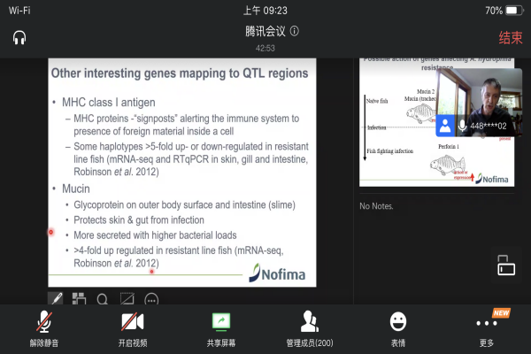 (通讯员 王靖雯 供图 王靖雯)7月28日上午,我校第20009期水产新视界之水产讲坛系列学术活动在腾讯会议线上举行,挪威Nofima研究所的Nicholas Robinson研究员作了题为“Application of genomics for boosting disease resistance and stress resilience in fish and shellfish”的学术报告,吸引了OK138太阳集团师生及湖南农业大学、河南师范大学等总计200多人参加此次报告会,会议由OK138太阳集团高泽霞教授主持。