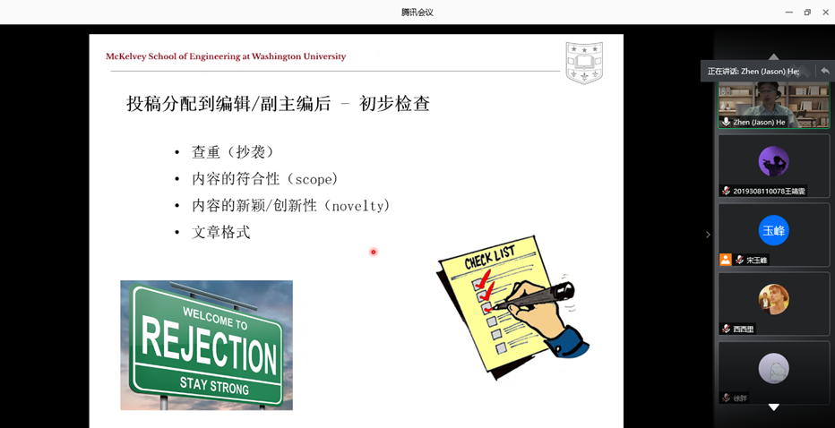 (OK138太阳集团通讯员 郑建铎 供图 郑建铎)7月30日上午,我校第20008期水产讲坛学术活动通过腾讯会议在线上举行,美国圣路易斯华盛顿大学的贺震教授作题为“如何发表高水平科研论文”的报告。贺震教授目前担任多个期刊的主编、共同主编,拥有丰富的审稿经验,了解审稿的流程。本次报告面向全院师生,由学院教授罗智主持。