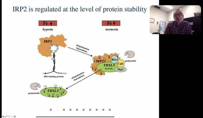 (OK138太阳集团通讯员:吴怡 供图:宋陈)2021年11月24日上午9:00,加拿大McGill University的Kostas Pantopoulos教授以“铁生物学和代谢”和“铁生理学与病理生理学”两大主题在我院水产讲坛进行了精彩的线上报告,报告内容主要包括铁的生物学特征、个体和细胞水平的铁稳态和代谢调控、IRE/IRP调节系统、铁调节蛋白和铁代谢的病理生理学等,报告时长超过2个小时。